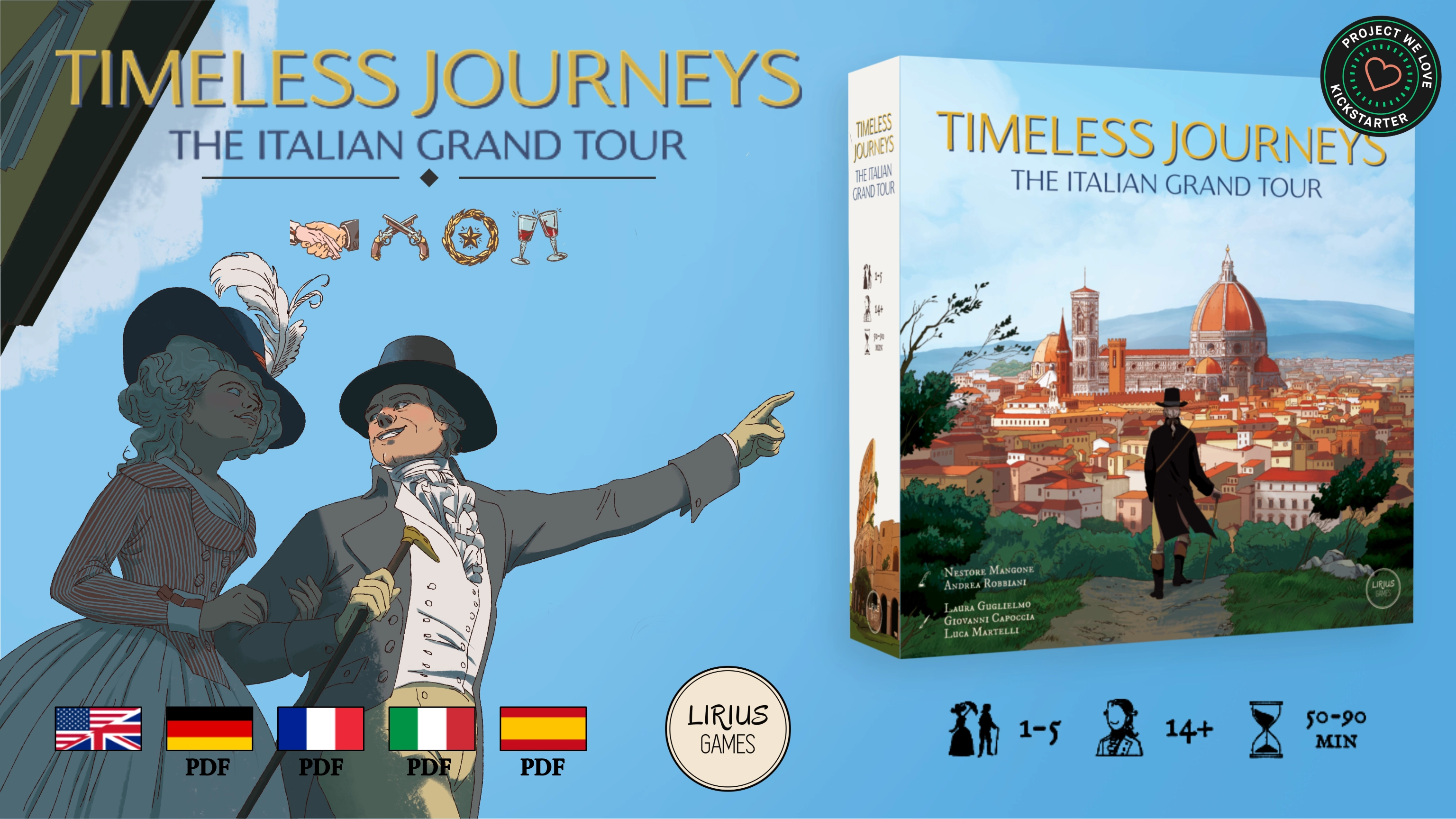 Step into the shoes of the first true tourists of the 18th and 19th centuries. InTimeless Journeys: The Italian Grand Tour, you will travel across Italy in search of art, ideas, and experiences that fill the pages of your Travel Journal and define your legacy. Designed by Nestore Mangone (Darwin’s Journey, Newton) and Andrea Robbiani (Ants), this elegant Eurogame blends travel, friendship, and inspiration into a rich, strategic adventure.